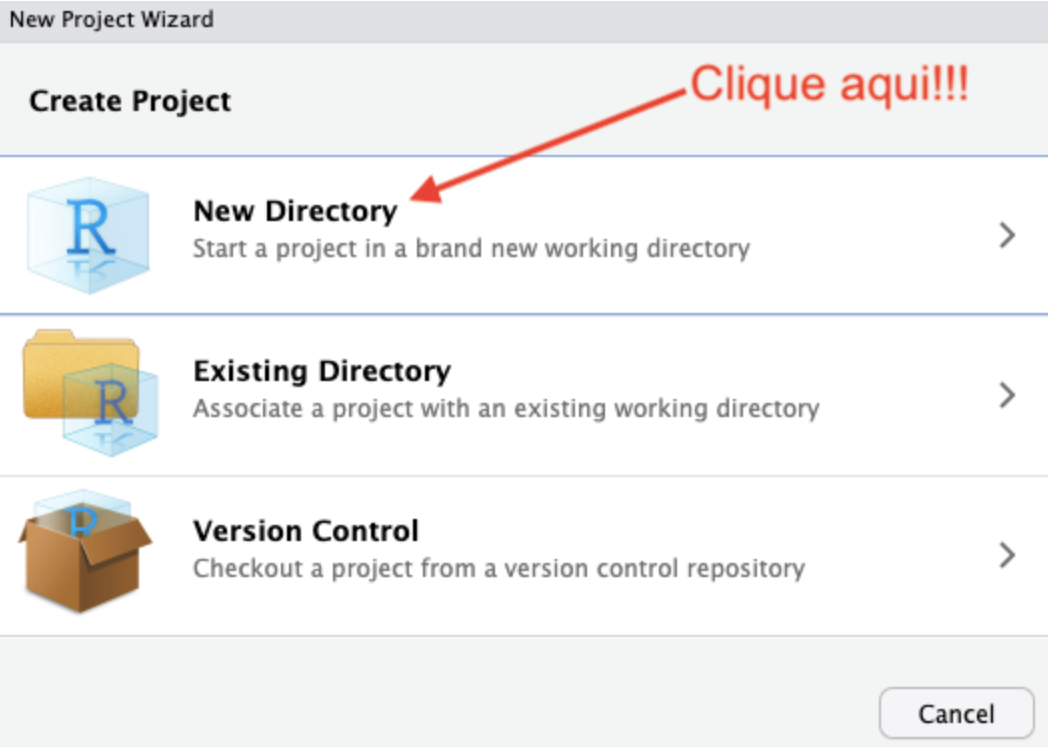 Para criar um projeto, acesse o menu File → New Project. Em seguida, podemos escolher criar um novo diretório ou usar um diretório existente para hospedar nosso projeto1. Vamos criar um novo diretório. Clique em New Directory.