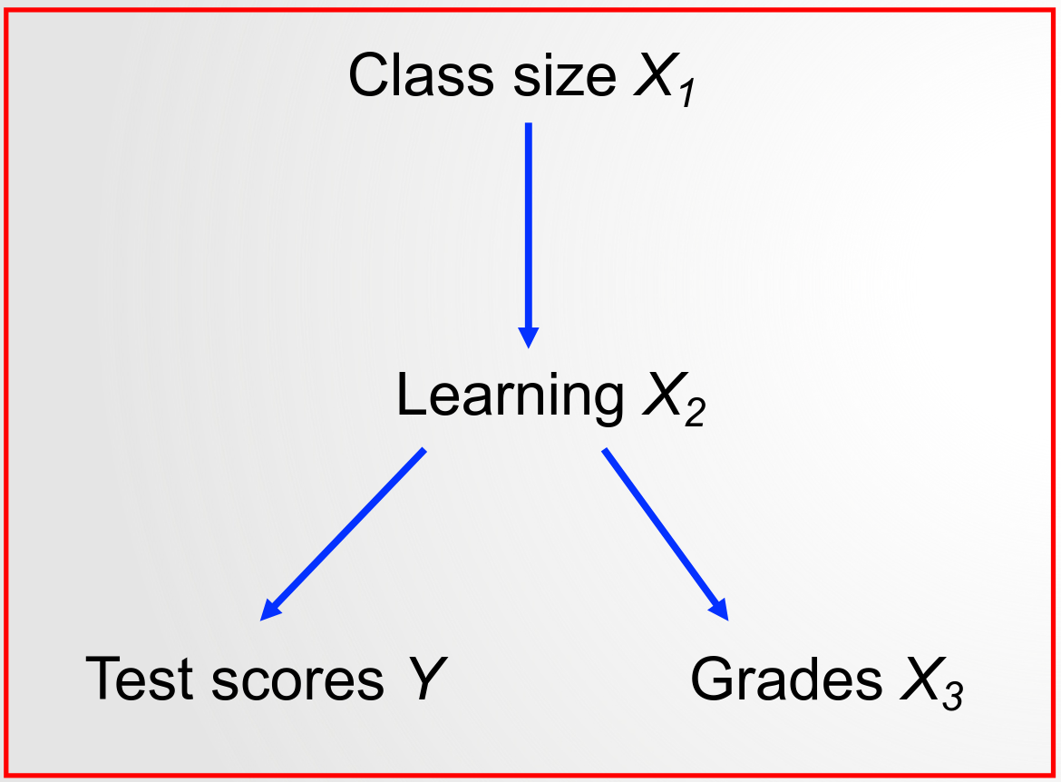 Exemplo hipotético: tamanho das turmas \(X_1\) é não correlacionada com o termo de erro somente após controlar pelos recursos financeiros do distrito \(X_2\)